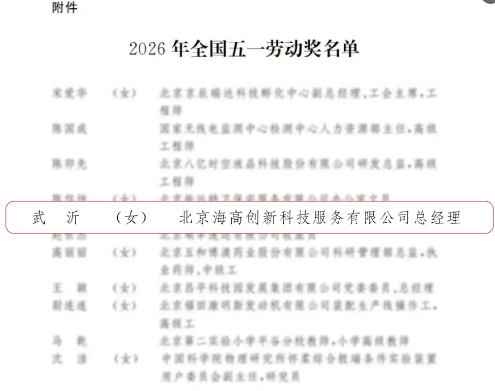 2026年4月28日,中华全国总工会正式公布2026 年全国五一劳动奖表彰名单。今年全国共表彰全国五一劳动奖3024个,其中全国五一劳动奖章1462名,北京海外高层次人才协会副理事长兼秘书长、北京海高创新科技服务有限公司总经理武沂获此国家级殊荣。